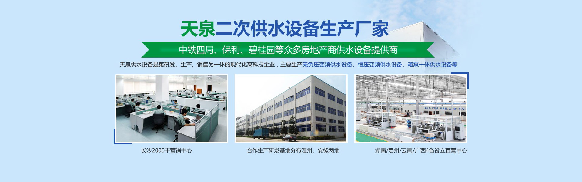 長(zhǎng)沙天泉供水設(shè)備有限公司位于長(zhǎng)沙雨花經(jīng)濟(jì)開(kāi)發(fā)區(qū)。公司是集研發(fā)、生產(chǎn)、銷(xiāo)售為一體的現(xiàn)代化科技型企業(yè)公司生產(chǎn)銷(xiāo)售的產(chǎn)品有無(wú)負(fù)壓變頻供水設(shè)備、自來(lái)水加壓泵站、變頻調(diào)速恒壓供水設(shè)備、智慧標(biāo)準(zhǔn)泵房、智慧水務(wù)、一體化預(yù)制泵站、循環(huán)水系統(tǒng)工程等二十幾大類別。